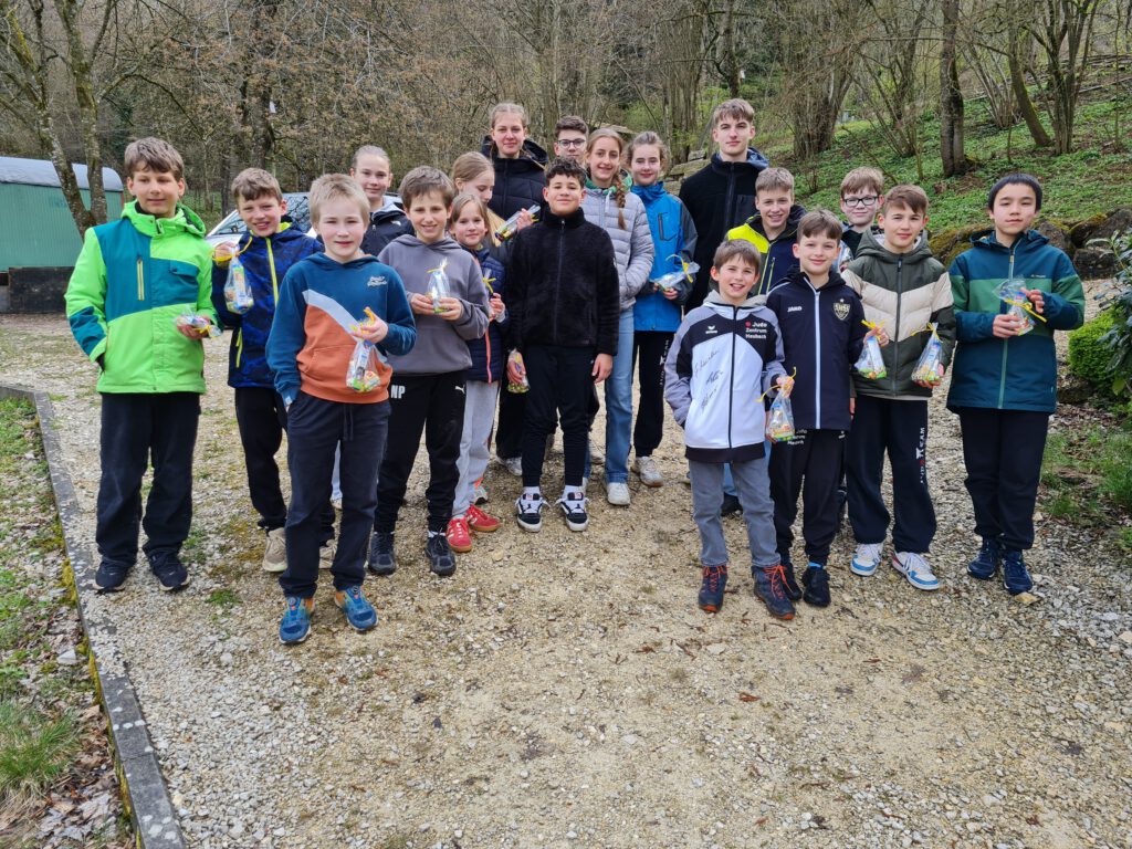 Im Anschluss an die Trainingseinheit ging es gemeinsam auf die nahe Wiese zum Ostereiersuchen. Auch zahlreiche Geschwister beteiligten sich an der Suche. Die versteckten Osterbeutel wurden schnell gefunden und sorgten für viel Freude bei allen Beteiligten.